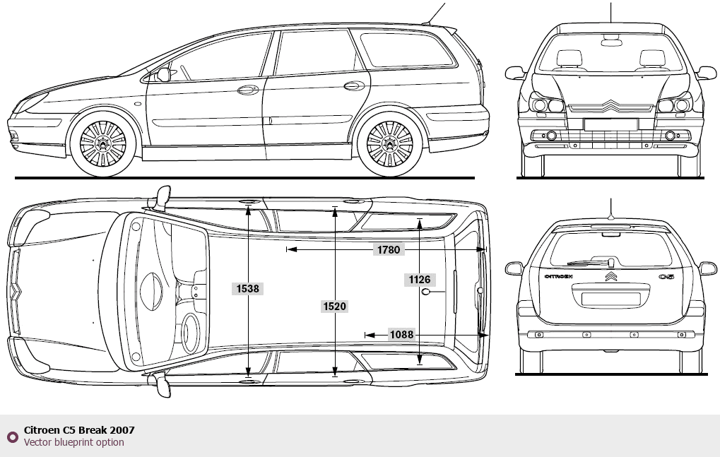 Raster blueprint of the 2007 Citroen C5 Break Wagon. This free downloadable image can be used for graphic projects, digital design, and 3D modeling. The file provides accurate exterior proportions of the vehicle. Model year: 2007. Body type: Wagon.