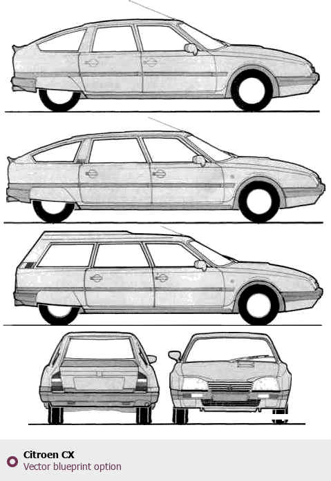 Raster blueprint of the Citroen CX Tag. This free downloadable image can be used for graphic projects, digital design, and 3D modeling. The file provides accurate exterior proportions of the vehicle. Body type: Tag.