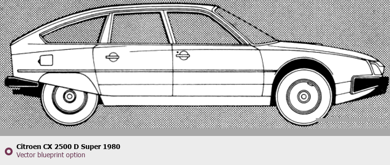 Raster blueprint of the 1980 Citroen CX 2500 D Super Tag. This free downloadable image can be used for graphic projects, digital design, and 3D modeling. The file provides accurate exterior proportions of the vehicle. Model year: 1980. Body type: Tag.