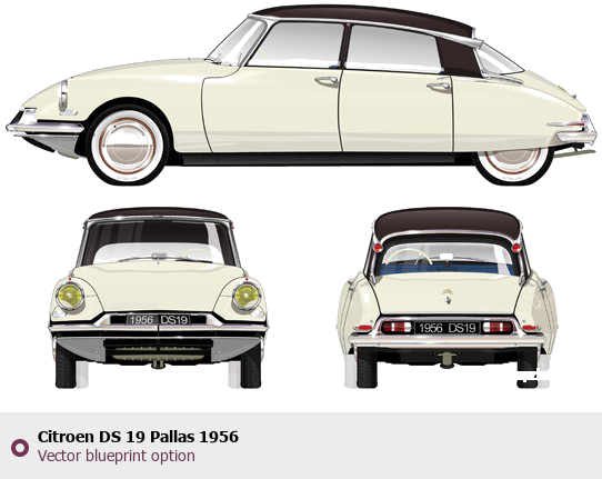 Raster blueprint of the 1956 Citroen DS 19 Pallas Tag. This free downloadable image can be used for graphic projects, digital design, and 3D modeling. The file provides accurate exterior proportions of the vehicle. Model year: 1956. Body type: Tag.