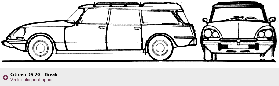 Raster blueprint of the Citroen DS 20 F Break Wagon. This free downloadable image can be used for graphic projects, digital design, and 3D modeling. The file provides accurate exterior proportions of the vehicle. Body type: Wagon.