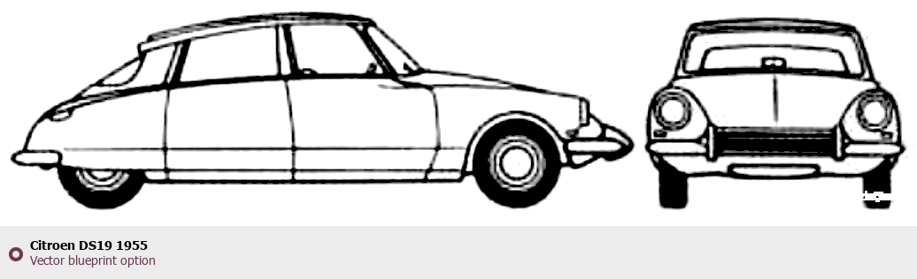 Raster blueprint of the 1955 Citroen DS19 Tag. This free downloadable image can be used for graphic projects, digital design, and 3D modeling. The file provides accurate exterior proportions of the vehicle. Model year: 1955. Body type: Tag.