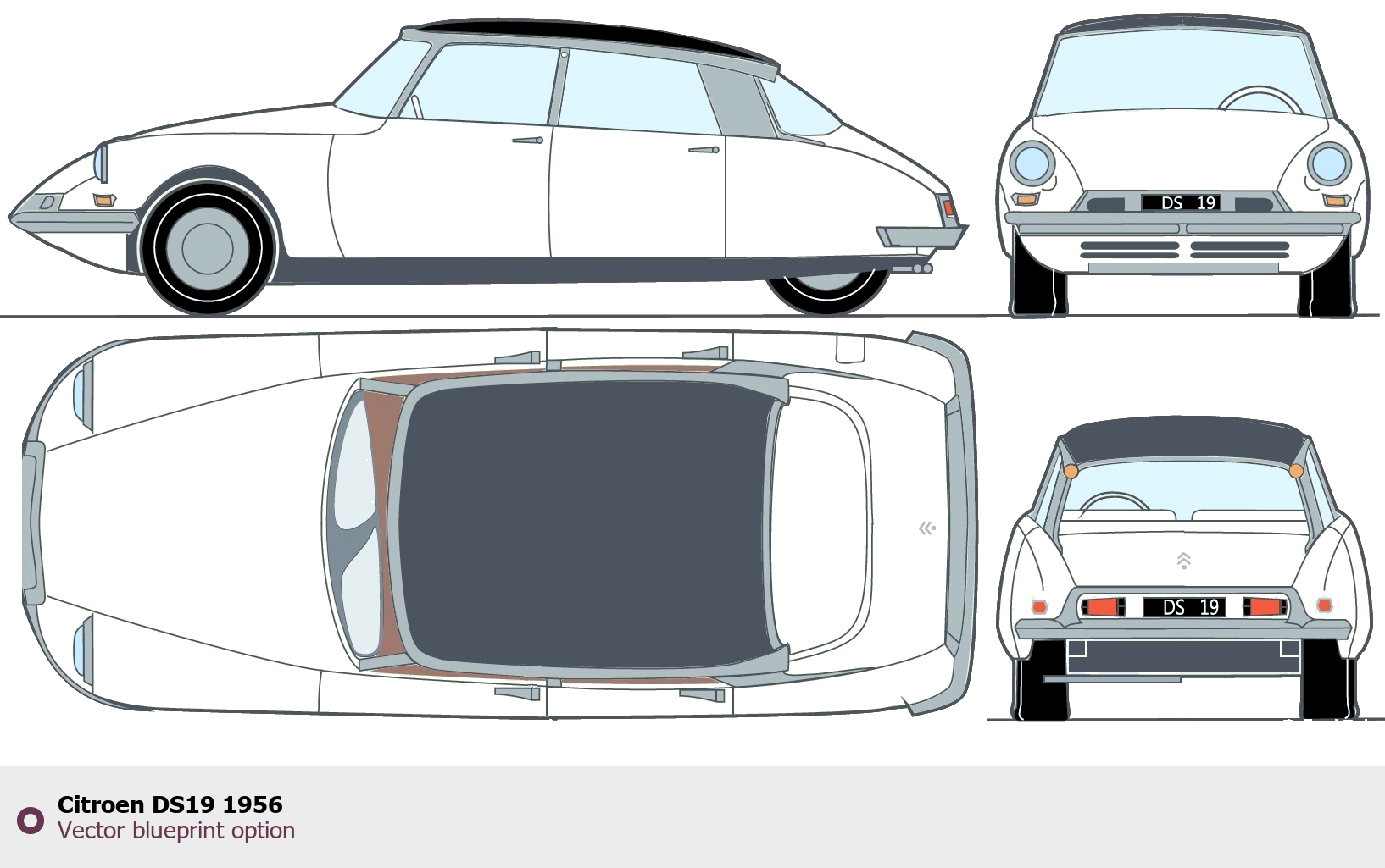 Raster blueprint of the 1956 Citroen DS19 Tag. This free downloadable image can be used for graphic projects, digital design, and 3D modeling. The file provides accurate exterior proportions of the vehicle. Model year: 1956. Body type: Tag.