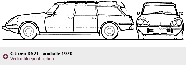 Raster blueprint of the 1970 Citroen DS21 Familialle Sedan. This free downloadable image can be used for graphic projects, digital design, and 3D modeling. The file provides accurate exterior proportions of the vehicle. Model year: 1970. Body type: Sedan.