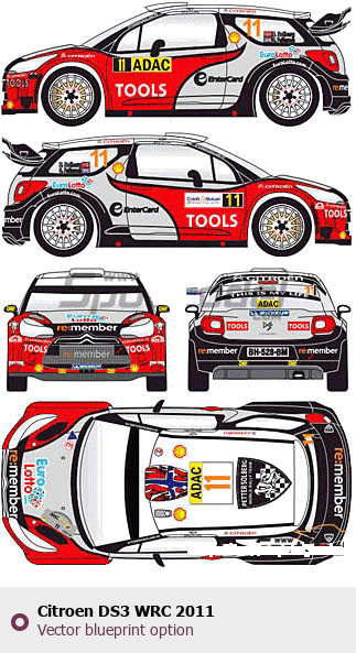 Raster blueprint of the 2011 Citroen DS3 WRC Tag. This free downloadable image can be used for graphic projects, digital design, and 3D modeling. The file provides accurate exterior proportions of the vehicle. Model year: 2011. Body type: Tag.