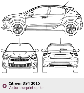 Raster blueprint of the 2015 Citroen DS4 Hatchback. This free downloadable image can be used for graphic projects, digital design, and 3D modeling. The file provides accurate exterior proportions of the vehicle. Model year: 2015. Body type: Hatchback.