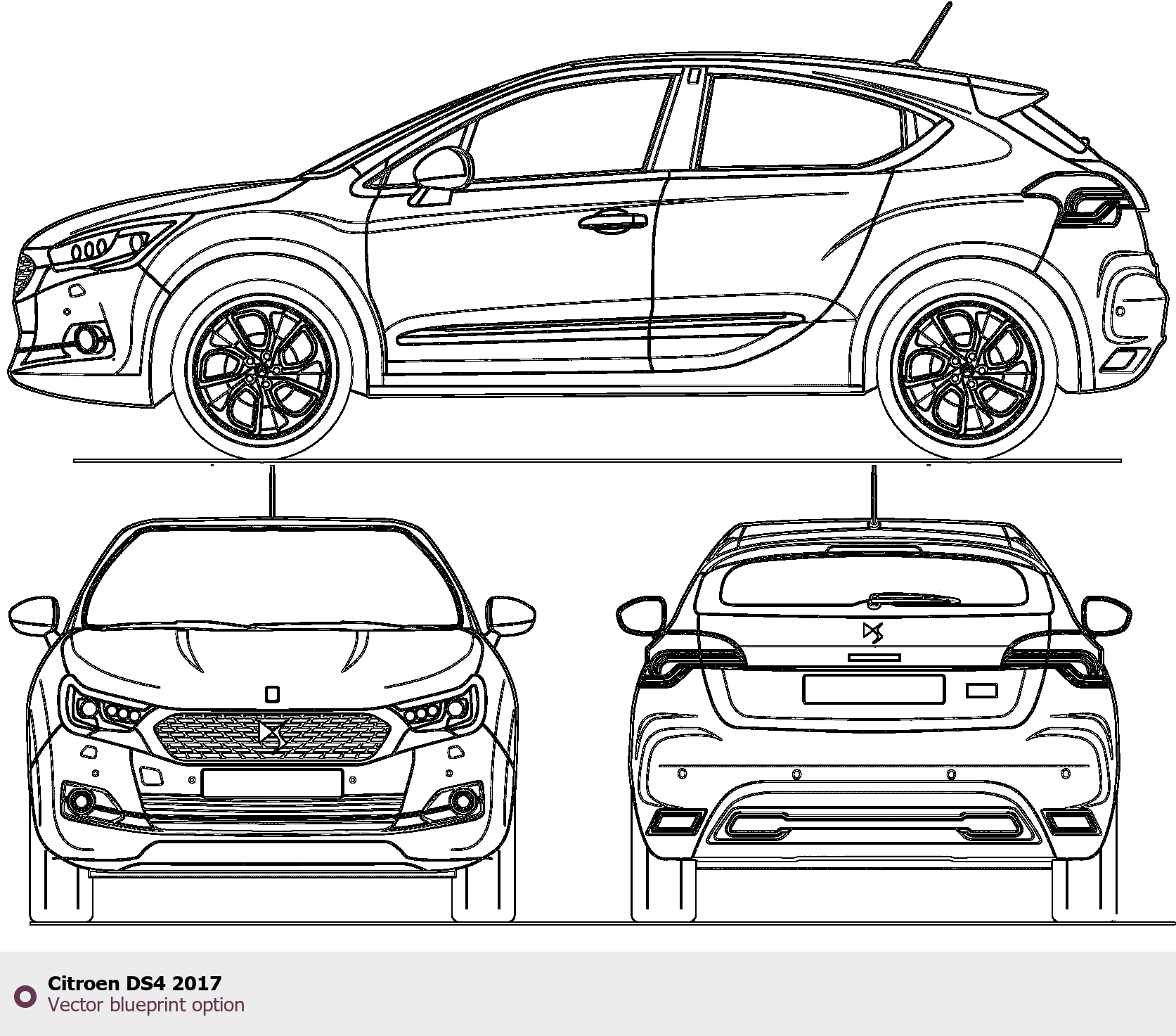 Raster blueprint of the 2017 Citroen DS4 Hatchback. This free downloadable image can be used for graphic projects, digital design, and 3D modeling. The file provides accurate exterior proportions of the vehicle. Model year: 2017. Body type: Hatchback.