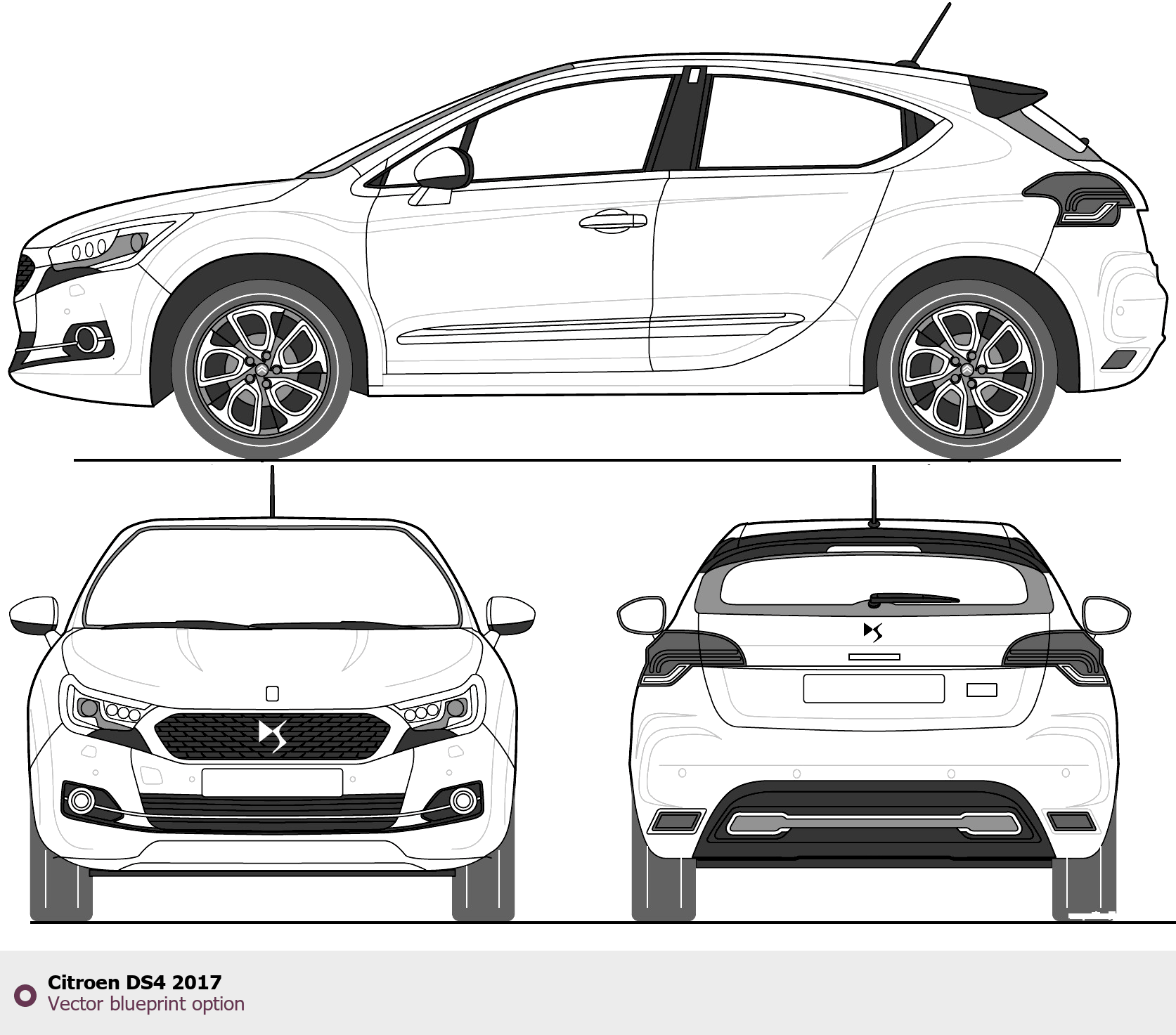 Raster blueprint of the 2017 Citroen DS4 Hatchback. This free downloadable image can be used for graphic projects, digital design, and 3D modeling. The file provides accurate exterior proportions of the vehicle. Model year: 2017. Body type: Hatchback.