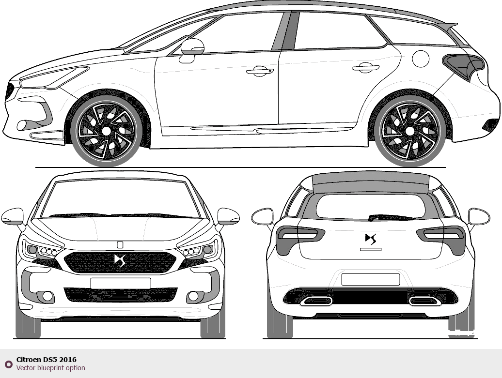 Raster blueprint of the 2016 Citroen DS5 Hatchback. This free downloadable image can be used for graphic projects, digital design, and 3D modeling. The file provides accurate exterior proportions of the vehicle. Model year: 2016. Body type: Hatchback.