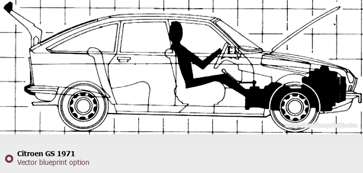 Raster blueprint of the 1971 Citroen GS Tag. This free downloadable image can be used for graphic projects, digital design, and 3D modeling. The file provides accurate exterior proportions of the vehicle. Model year: 1971. Body type: Tag.