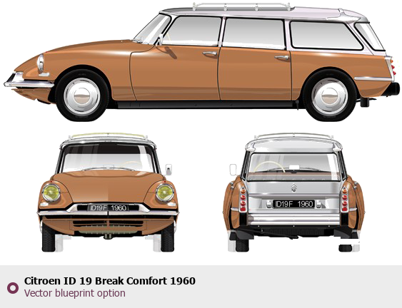Raster blueprint of the 1960 Citroen ID 19 Break Comfort Wagon. This free downloadable image can be used for graphic projects, digital design, and 3D modeling. The file provides accurate exterior proportions of the vehicle. Model year: 1960. Body type: Wagon.