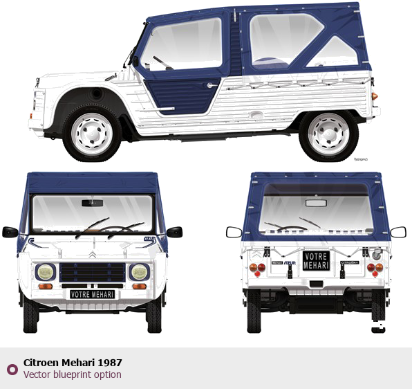 Raster blueprint of the 1987 Citroen Mehari Tag. This free downloadable image can be used for graphic projects, digital design, and 3D modeling. The file provides accurate exterior proportions of the vehicle. Model year: 1987. Body type: Tag.