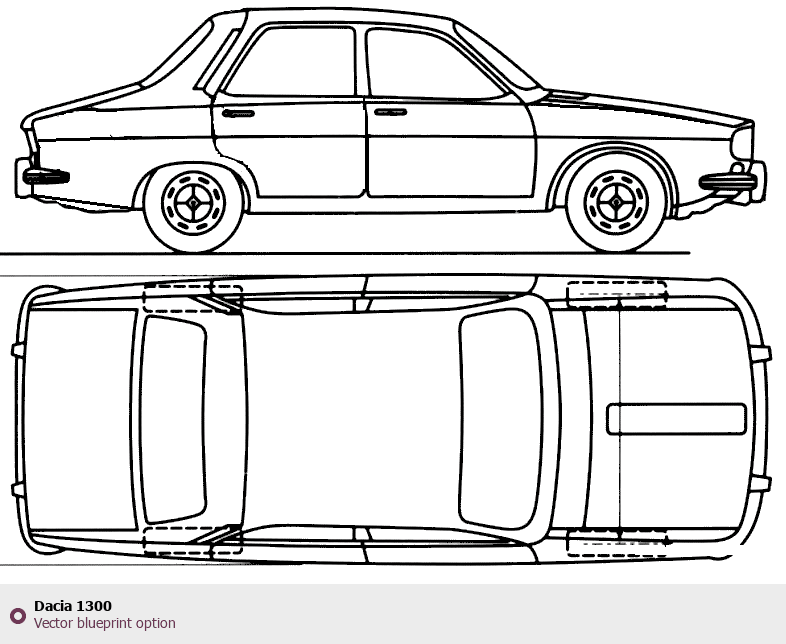 Raster blueprint of the Dacia 1300 Tag. This free downloadable image can be used for graphic projects, digital design, and 3D modeling. The file provides accurate exterior proportions of the vehicle. Body type: Tag.