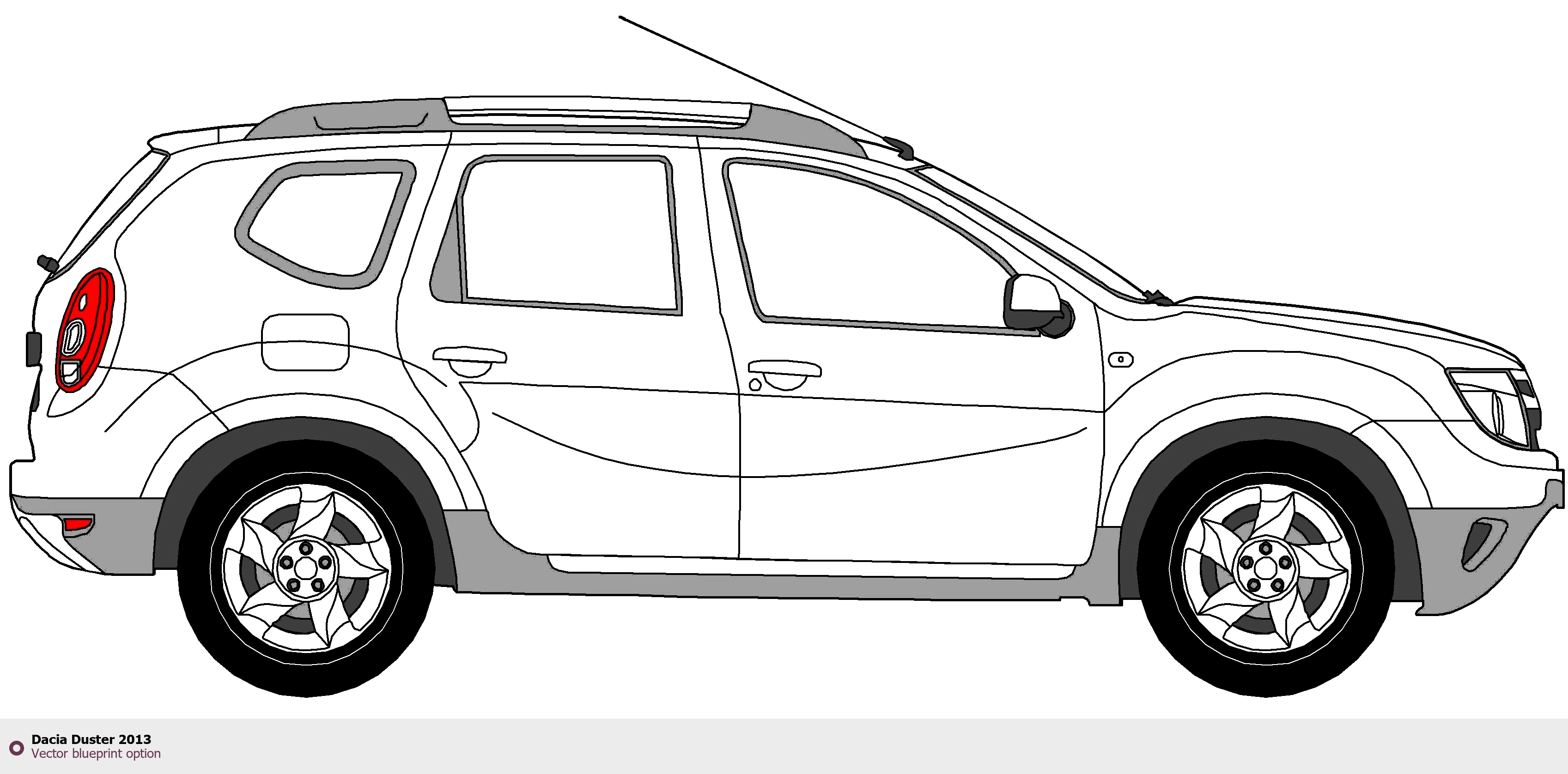 Raster blueprint of the 2013 Dacia Duster SUV. This free downloadable image can be used for graphic projects, digital design, and 3D modeling. The file provides accurate exterior proportions of the vehicle. Model year: 2013. Body type: SUV.
