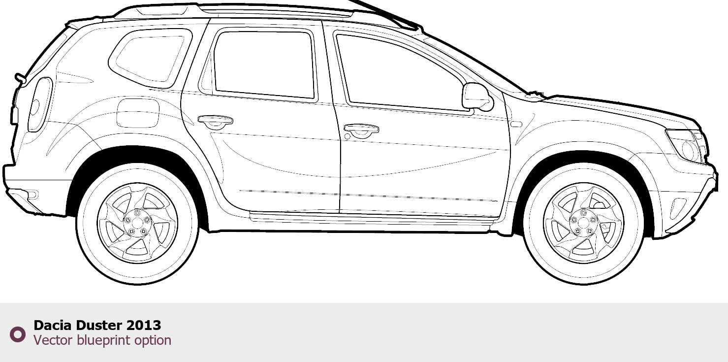 Raster blueprint of the 2013 Dacia Duster SUV. This free downloadable image can be used for graphic projects, digital design, and 3D modeling. The file provides accurate exterior proportions of the vehicle. Model year: 2013. Body type: SUV.