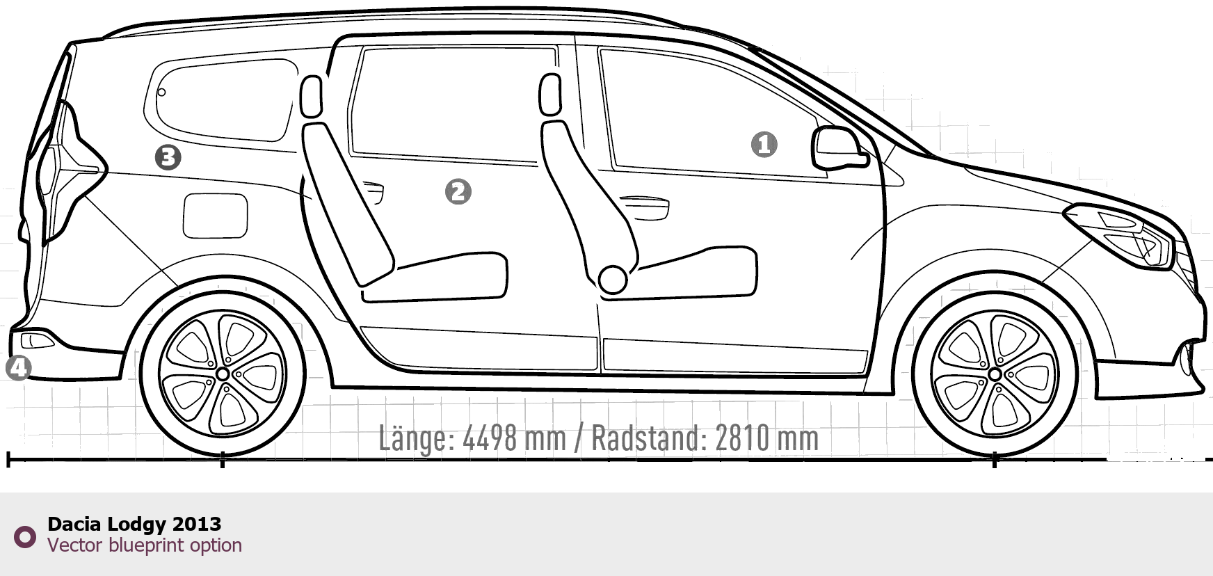 Raster blueprint of the 2013 Dacia Lodgy Minivan. This free downloadable image can be used for graphic projects, digital design, and 3D modeling. The file provides accurate exterior proportions of the vehicle. Model year: 2013. Body type: Minivan.