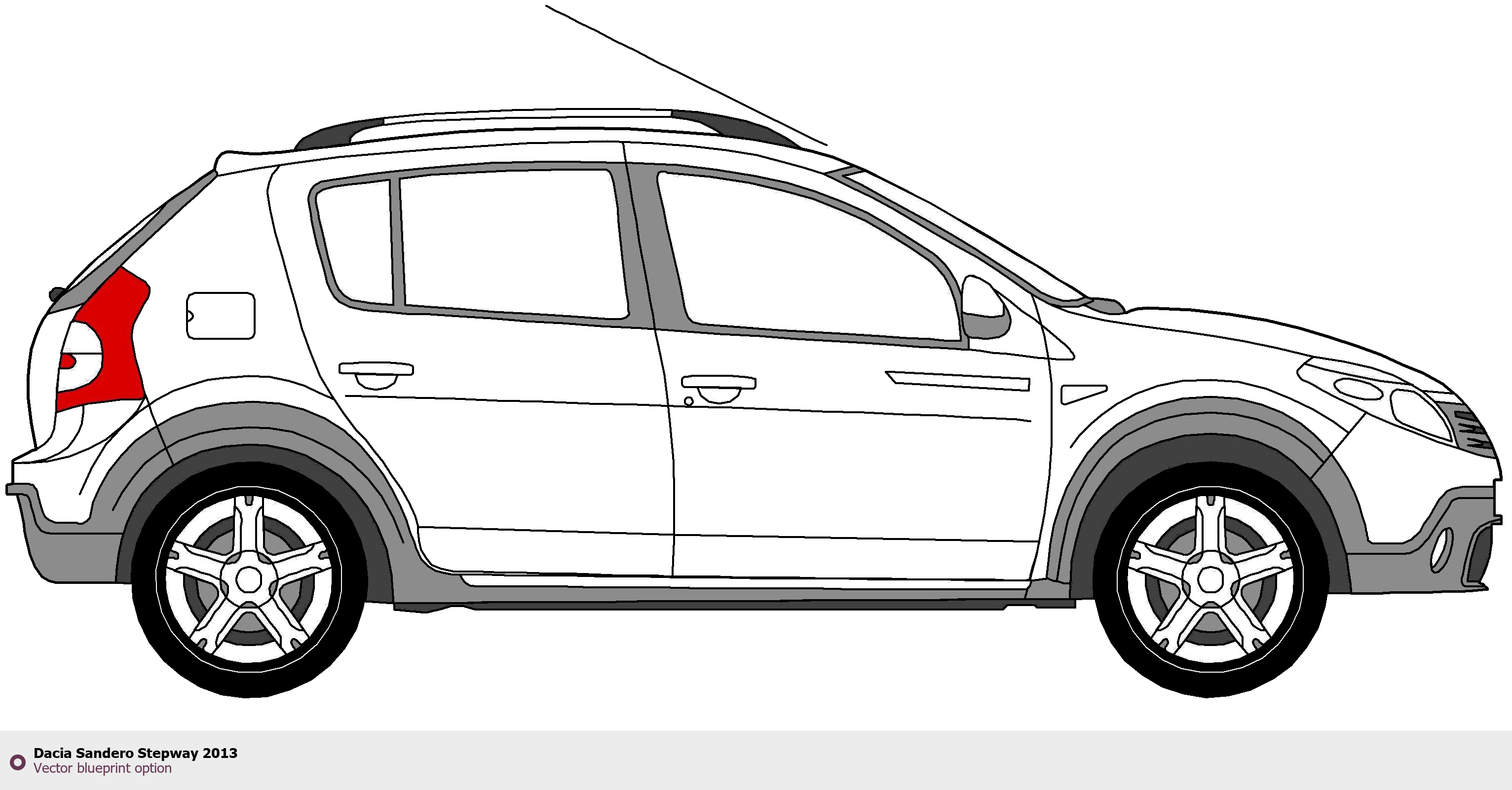 Raster blueprint of the 2013 Dacia Sandero Stepway Hatchback. This free downloadable image can be used for graphic projects, digital design, and 3D modeling. The file provides accurate exterior proportions of the vehicle. Model year: 2013. Body type: Hatchback.
