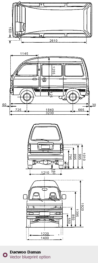 Raster blueprint of the Daewoo Damas Microvan. This free downloadable image can be used for graphic projects, digital design, and 3D modeling. The file provides accurate exterior proportions of the vehicle. Body type: Microvan.