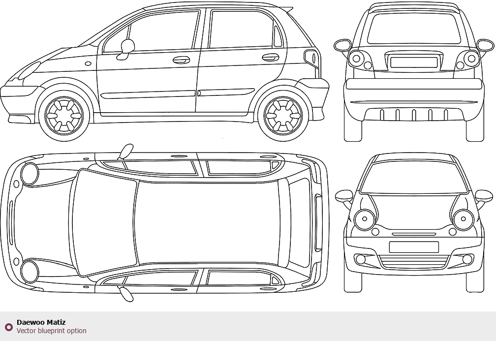 Raster blueprint of the Daewoo Matiz Hatchback. This free downloadable image can be used for graphic projects, digital design, and 3D modeling. The file provides accurate exterior proportions of the vehicle. Body type: Hatchback.