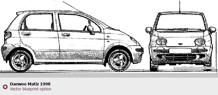Raster blueprint of the 1998 Daewoo Matiz Hatchback. This free downloadable image can be used for graphic projects, digital design, and 3D modeling. The file provides accurate exterior proportions of the vehicle. Model year: 1998. Body type: Hatchback.