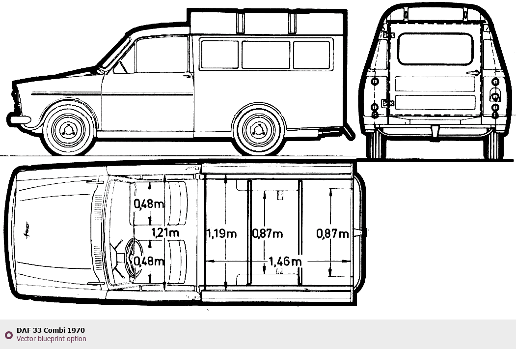 Raster blueprint of the 1970 DAF 33 Combi Hatchback. This free downloadable image can be used for graphic projects, digital design, and 3D modeling. The file provides accurate exterior proportions of the vehicle. Model year: 1970. Body type: Hatchback.