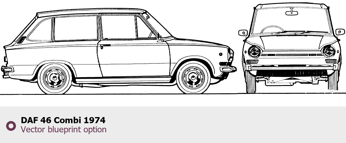 Raster blueprint of the 1974 DAF 46 Combi Hatchback. This free downloadable image can be used for graphic projects, digital design, and 3D modeling. The file provides accurate exterior proportions of the vehicle. Model year: 1974. Body type: Hatchback.