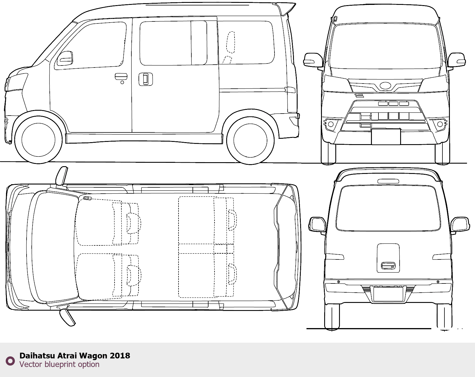 Raster blueprint of the 2018 Daihatsu Atrai Wagon Wagon. This free downloadable image can be used for graphic projects, digital design, and 3D modeling. The file provides accurate exterior proportions of the vehicle. Model year: 2018. Body type: Wagon.