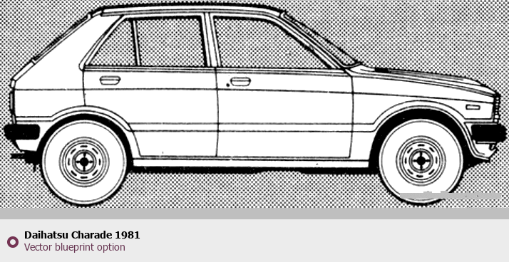 Raster blueprint of the 1981 Daihatsu Charade Hatchback. This free downloadable image can be used for graphic projects, digital design, and 3D modeling. The file provides accurate exterior proportions of the vehicle. Model year: 1981. Body type: Hatchback.