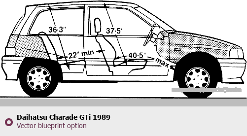 Raster blueprint of the 1989 Daihatsu Charade GTi Hatchback. This free downloadable image can be used for graphic projects, digital design, and 3D modeling. The file provides accurate exterior proportions of the vehicle. Model year: 1989. Body type: Hatchback.