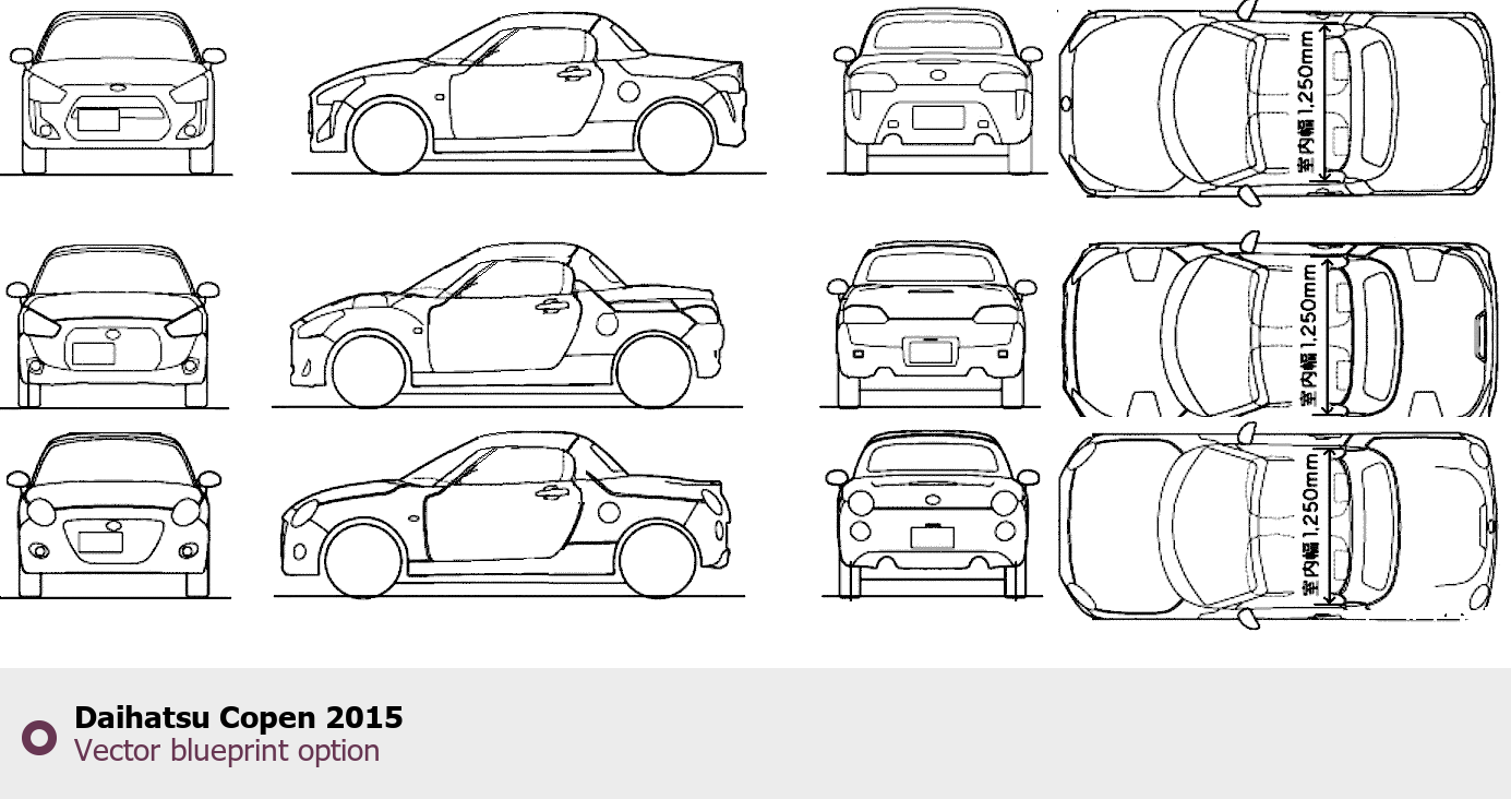 Raster blueprint of the 2015 Daihatsu Copen Roadster. This free downloadable image can be used for graphic projects, digital design, and 3D modeling. The file provides accurate exterior proportions of the vehicle. Model year: 2015. Body type: Roadster.