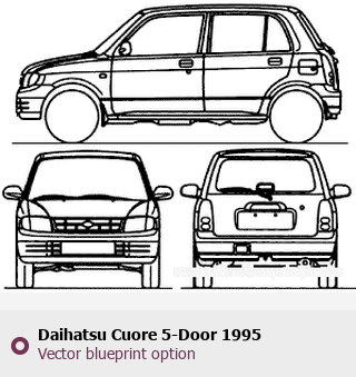 Raster blueprint of the 1995 Daihatsu Cuore 5-Door Tag. This free downloadable image can be used for graphic projects, digital design, and 3D modeling. The file provides accurate exterior proportions of the vehicle. Model year: 1995. Body type: Tag.