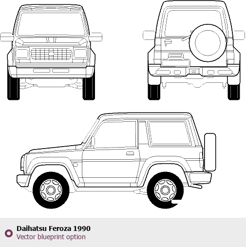 Raster blueprint of the 1990 Daihatsu Feroza Tag. This free downloadable image can be used for graphic projects, digital design, and 3D modeling. The file provides accurate exterior proportions of the vehicle. Model year: 1990. Body type: Tag.