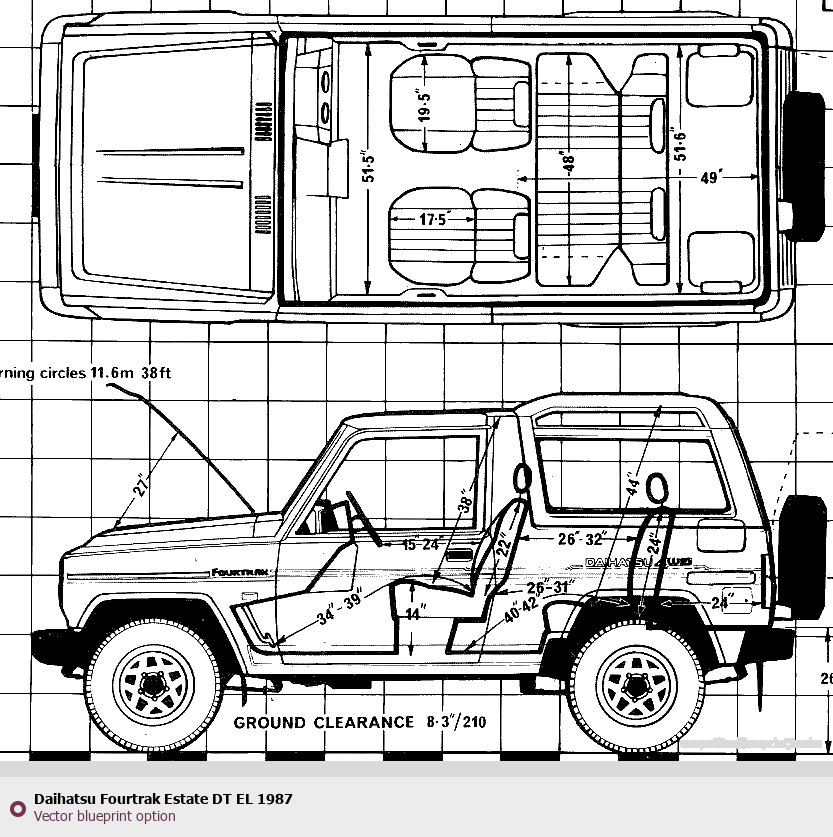 Raster blueprint of the 1987 Daihatsu Fourtrak Estate DT EL Wagon. This free downloadable image can be used for graphic projects, digital design, and 3D modeling. The file provides accurate exterior proportions of the vehicle. Model year: 1987. Body type: Wagon.