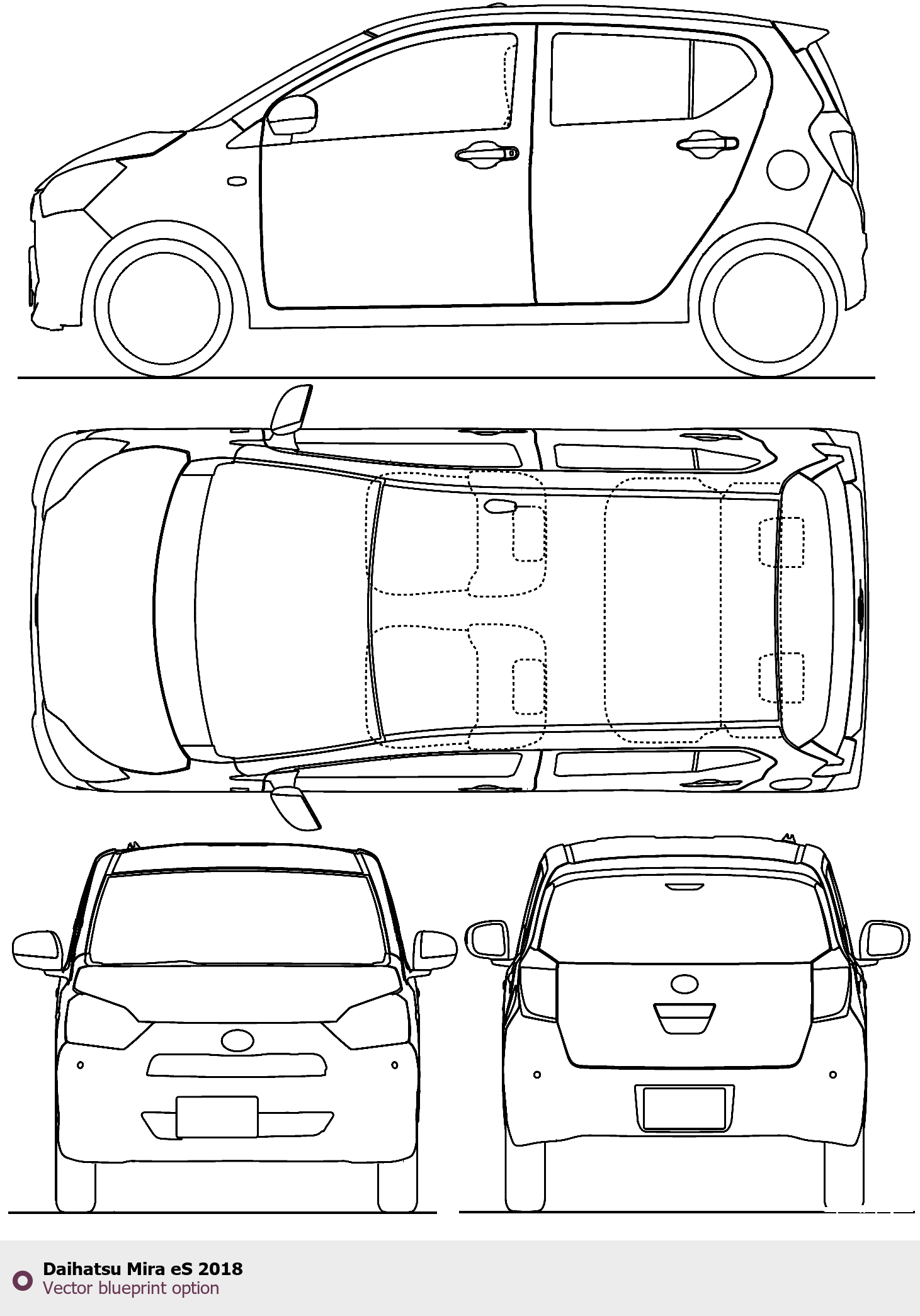 Raster blueprint of the 2018 Daihatsu Mira eS Tag. This free downloadable image can be used for graphic projects, digital design, and 3D modeling. The file provides accurate exterior proportions of the vehicle. Model year: 2018. Body type: Tag.
