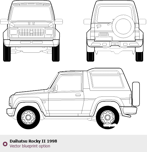 Raster blueprint of the 1998 Daihatsu Rocky II Tag. This free downloadable image can be used for graphic projects, digital design, and 3D modeling. The file provides accurate exterior proportions of the vehicle. Model year: 1998. Body type: Tag.