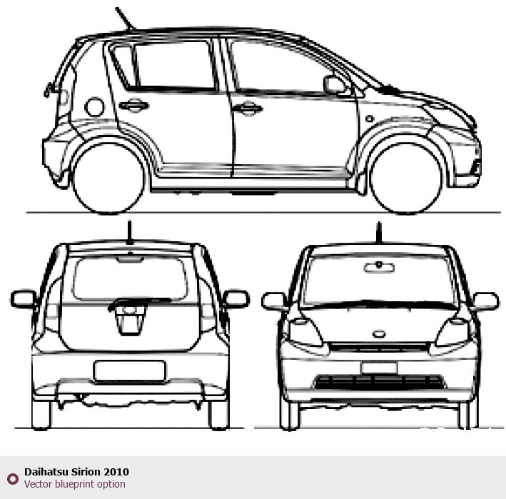 Raster blueprint of the 2010 Daihatsu Sirion Hatchback. This free downloadable image can be used for graphic projects, digital design, and 3D modeling. The file provides accurate exterior proportions of the vehicle. Model year: 2010. Body type: Hatchback.