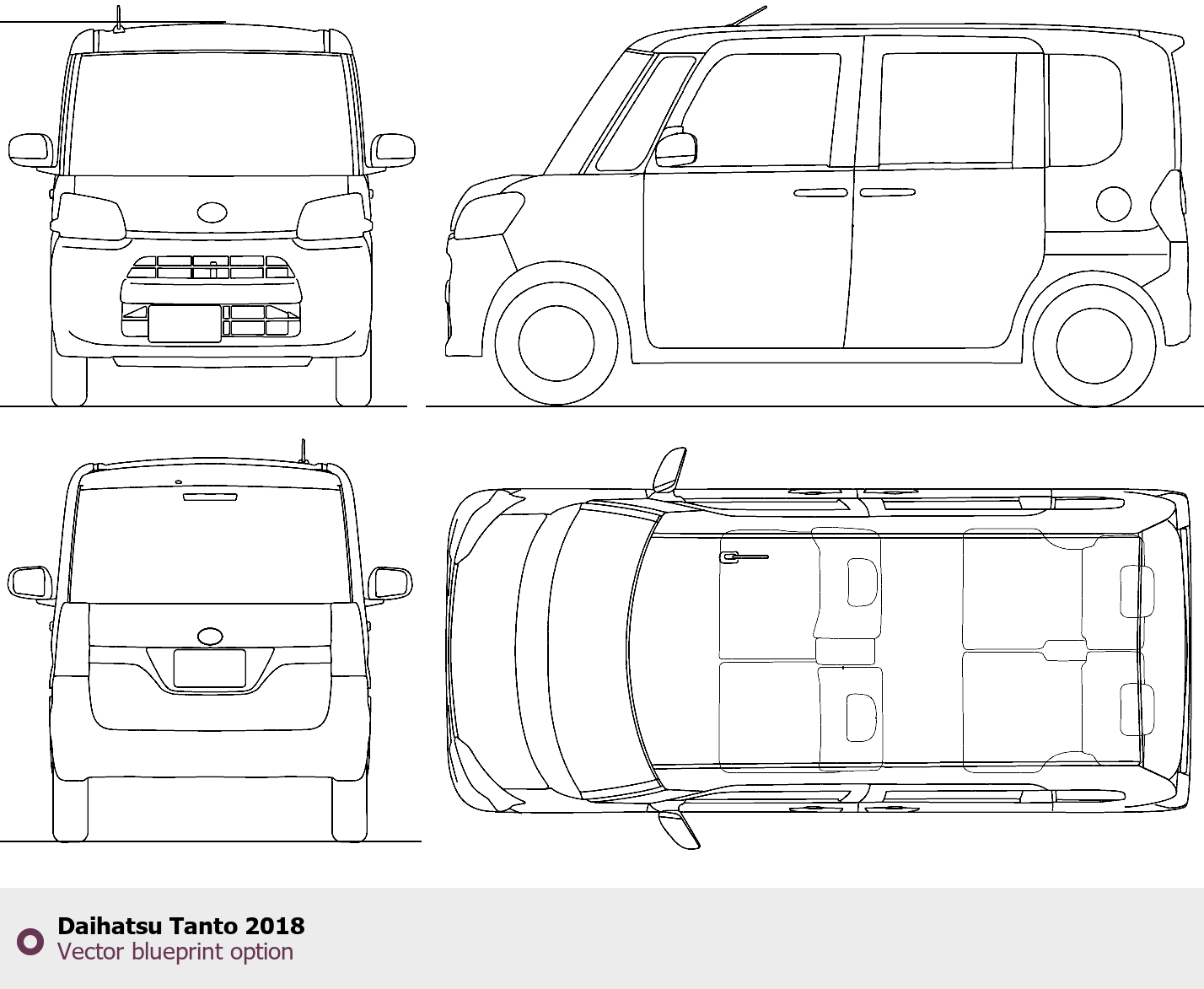 Raster blueprint of the 2018 Daihatsu Tanto Microvan. This free downloadable image can be used for graphic projects, digital design, and 3D modeling. The file provides accurate exterior proportions of the vehicle. Model year: 2018. Body type: Microvan.