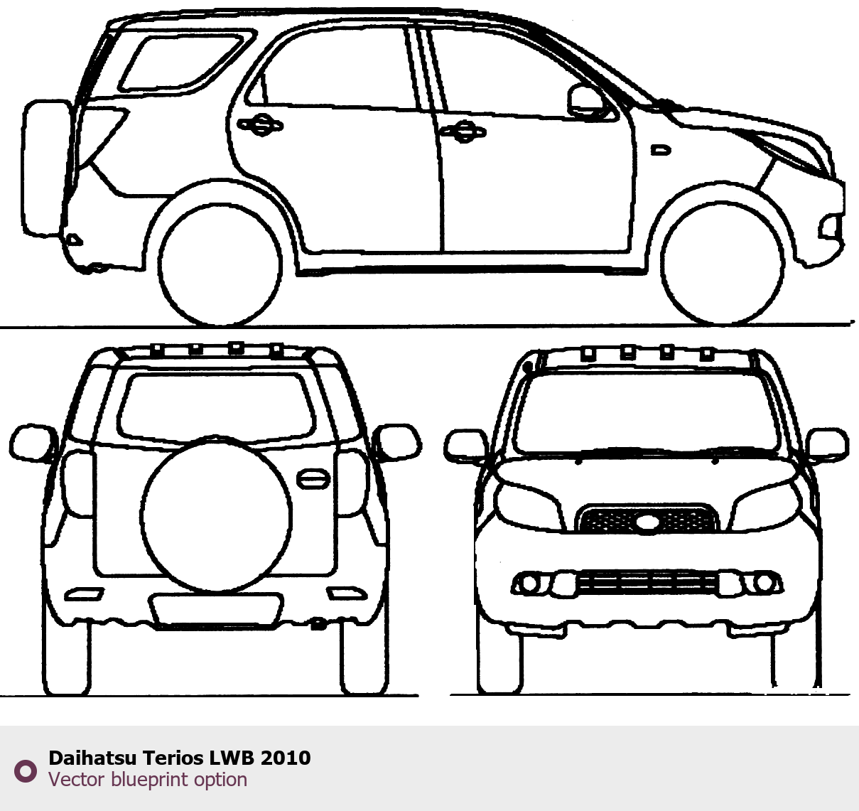 Raster blueprint of the 2010 Daihatsu Terios LWB SUV. This free downloadable image can be used for graphic projects, digital design, and 3D modeling. The file provides accurate exterior proportions of the vehicle. Model year: 2010. Body type: SUV.