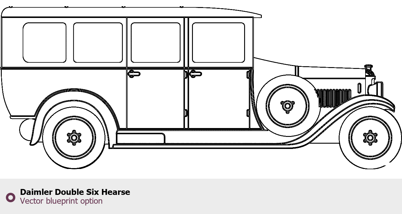 Raster blueprint of the Daimler Double Six Hearse Sedan. This free downloadable image can be used for graphic projects, digital design, and 3D modeling. The file provides accurate exterior proportions of the vehicle. Body type: Sedan.