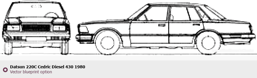 Raster blueprint of the 1980 Datsun 220C Cedric Diesel 430 Tag. This free downloadable image can be used for graphic projects, digital design, and 3D modeling. The file provides accurate exterior proportions of the vehicle. Model year: 1980. Body type: Tag.