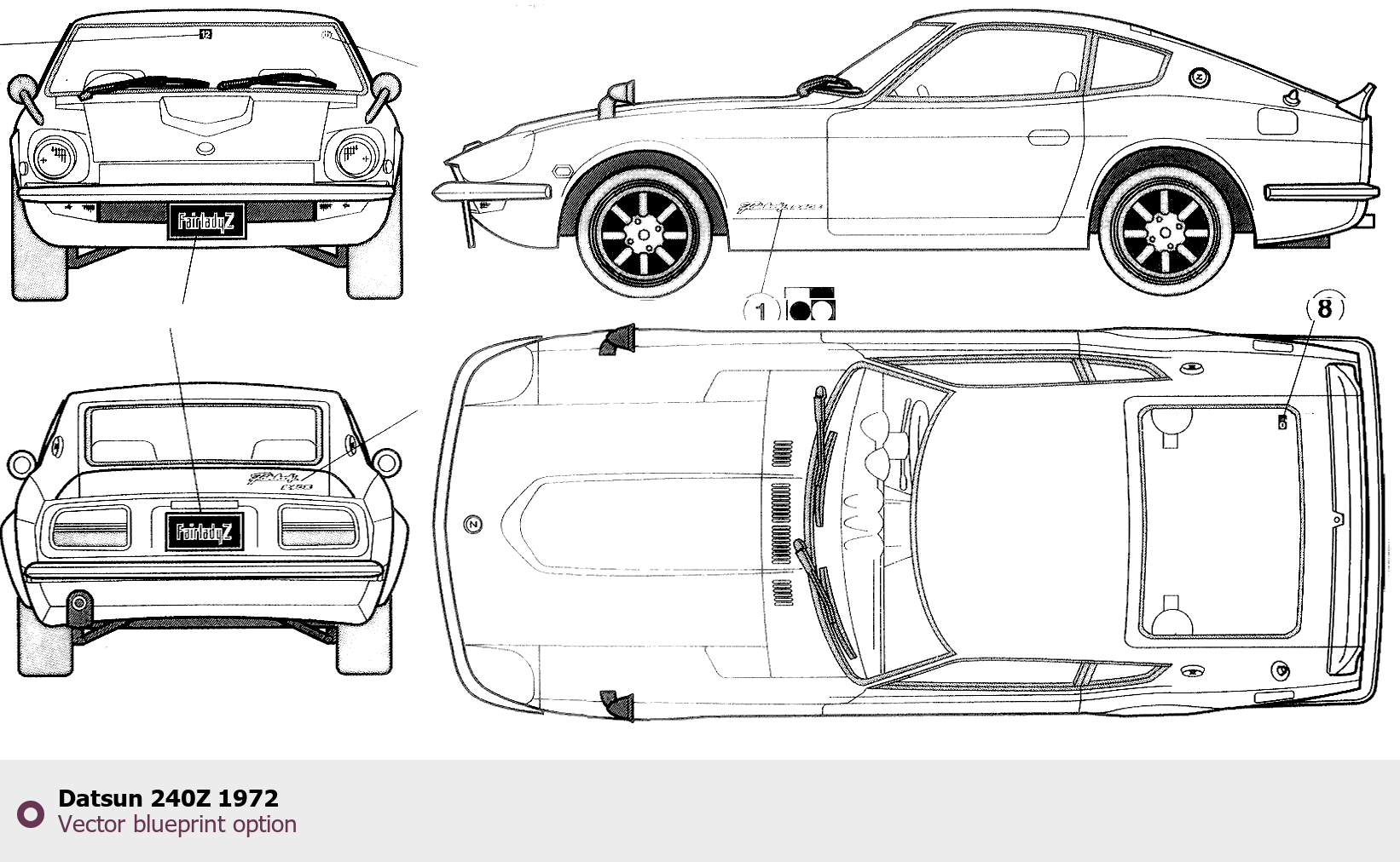 Raster blueprint of the 1972 Datsun 240Z Tag. This free downloadable image can be used for graphic projects, digital design, and 3D modeling. The file provides accurate exterior proportions of the vehicle. Model year: 1972. Body type: Tag.