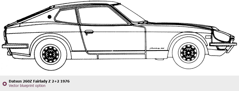 Raster blueprint of the 1976 Datsun 260Z Fairlady Z 2+2 Tag. This free downloadable image can be used for graphic projects, digital design, and 3D modeling. The file provides accurate exterior proportions of the vehicle. Model year: 1976. Body type: Tag.