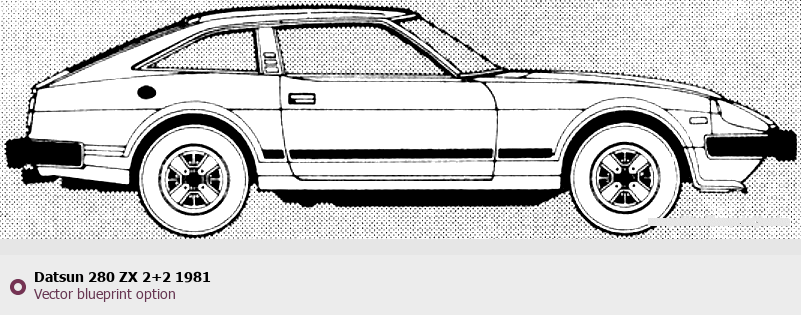 Raster blueprint of the 1981 Datsun 280 ZX 2+2 Tag. This free downloadable image can be used for graphic projects, digital design, and 3D modeling. The file provides accurate exterior proportions of the vehicle. Model year: 1981. Body type: Tag.