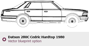 Raster blueprint of the 1980 Datsun 280C Cedric Hardtop Tag. This free downloadable image can be used for graphic projects, digital design, and 3D modeling. The file provides accurate exterior proportions of the vehicle. Model year: 1980. Body type: Tag.
