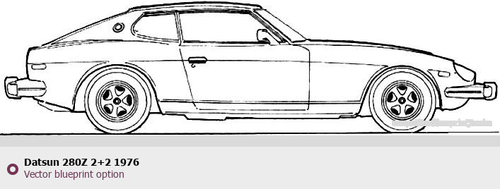 Raster blueprint of the 1976 Datsun 280Z 2+2 Tag. This free downloadable image can be used for graphic projects, digital design, and 3D modeling. The file provides accurate exterior proportions of the vehicle. Model year: 1976. Body type: Tag.