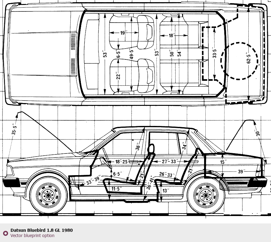 Raster blueprint of the 1980 Datsun Bluebird 1.8 GL Tag. This free downloadable image can be used for graphic projects, digital design, and 3D modeling. The file provides accurate exterior proportions of the vehicle. Model year: 1980. Body type: Tag.