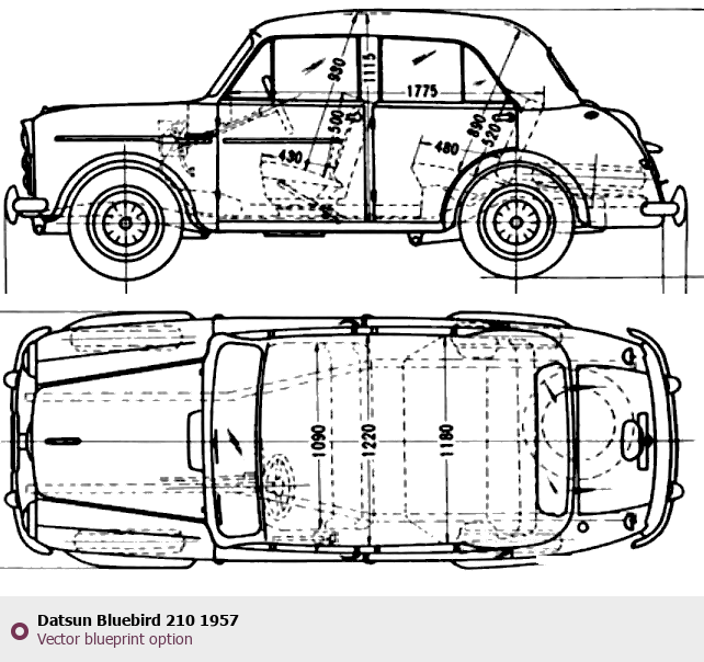 Raster blueprint of the 1957 Datsun Bluebird 210 Tag. This free downloadable image can be used for graphic projects, digital design, and 3D modeling. The file provides accurate exterior proportions of the vehicle. Model year: 1957. Body type: Tag.