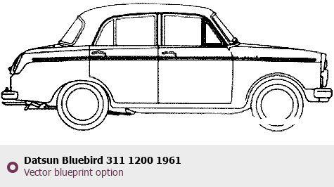 Raster blueprint of the 1961 Datsun Bluebird 311 1200 Tag. This free downloadable image can be used for graphic projects, digital design, and 3D modeling. The file provides accurate exterior proportions of the vehicle. Model year: 1961. Body type: Tag.