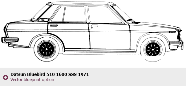 Raster blueprint of the 1971 Datsun Bluebird 510 1600 SSS Tag. This free downloadable image can be used for graphic projects, digital design, and 3D modeling. The file provides accurate exterior proportions of the vehicle. Model year: 1971. Body type: Tag.