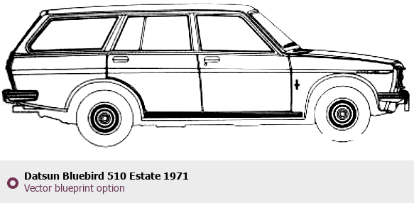 Raster blueprint of the 1971 Datsun Bluebird 510 Estate Wagon. This free downloadable image can be used for graphic projects, digital design, and 3D modeling. The file provides accurate exterior proportions of the vehicle. Model year: 1971. Body type: Wagon.